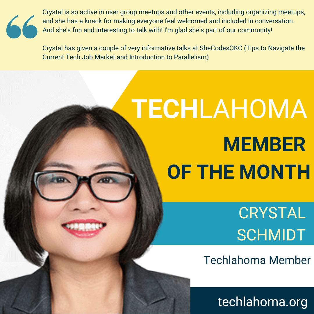 Crystal has given a couple very informative talks at SheCodesOKC (Tips to Navigate Current Tech Job Market and Introduction to Parallelism)