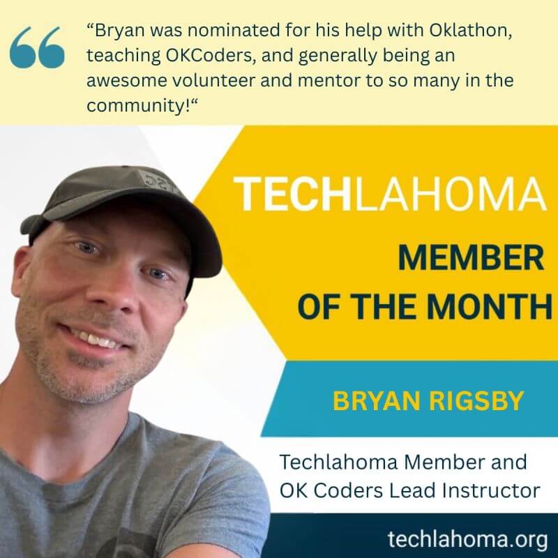 Bryan was nominated for his help with Oklathon, teaching OKCoders, and generally being an awesome volunteer and mentor to so many in the community!